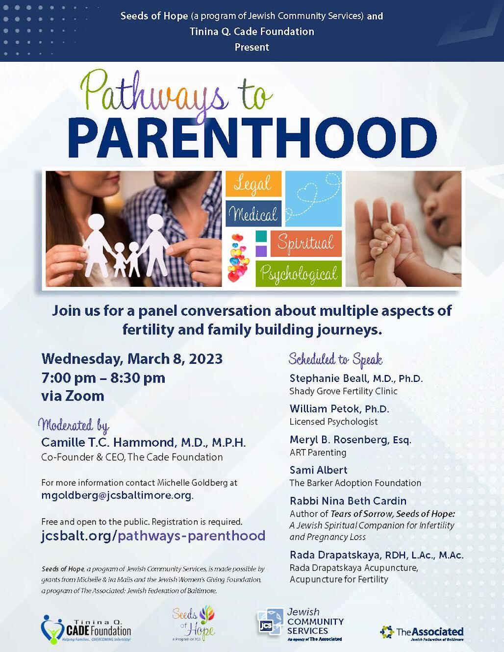 Thinking about growing your family or looking for support after struggling to conceive? Trying out how to reconcile your faith with infertility? Infertility affects one out of every 8- but you can still become a parent! Please join us for "Pathways to Parenthood"- a symposium about different ways to become a parent featuring experts and supports for families with infertility.